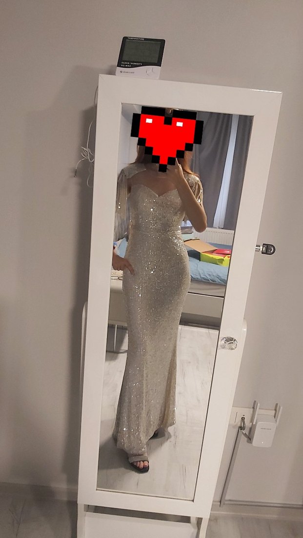 Parlak bej kumaştan, straplez yaka ve drapeli detaylara sahip, vücuda oturan uzun abiye elbise. İnce askılı kollu ve çağdaş tarzda, düğün için uygun. ✨