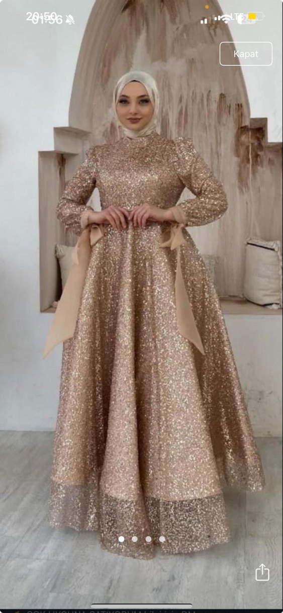 Parlak Bej Uzun Kollu Abiye Elbise kiralık satılık fiyatı 2500