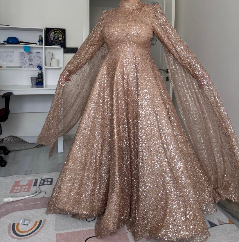 Parlak kumaştan yapılmış, yüksek yakalı ve uzun kollu bej uzun abiye elbise, rahat kesimi ve çağdaş stiliyle şıklık sunar. ✨