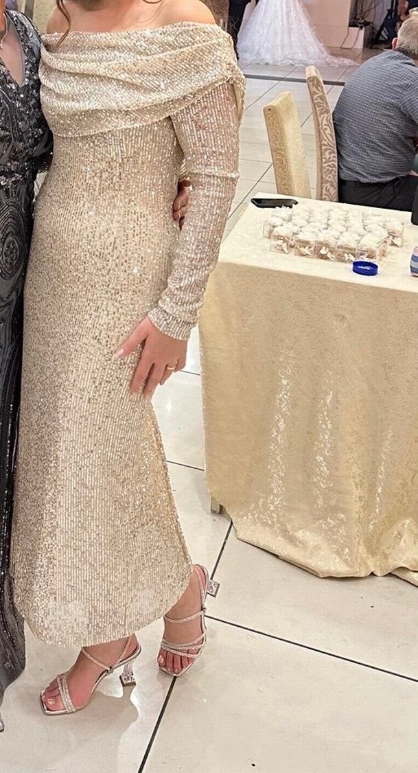 Parlak bej renginde, uzun kollu ve payetli, şık dar kesim abiye elbise. Yaka tipi straplez, arkadan yırtmaçlı, düğün ve nişan için çok uygun.