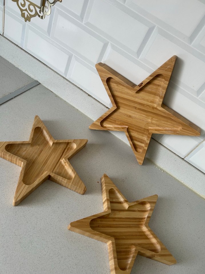 Parlak bej renginde, yıldız şekilli ahşap sunumluk . doğal ahşap 3 lü set 1 adet büyük 2 adet küçük .