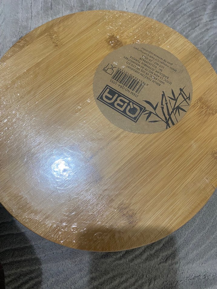 Parlak bej renkte yuvarlak bambu kesme tahtası, mutfakta dayanıklı ve doğal bir yüzey sunar.