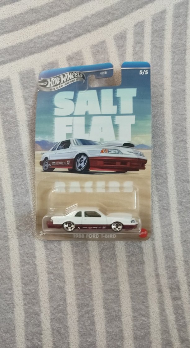 Parlak beyaz renkte 1988 Ford T-Bird oyuncak araba, detaylı tasarım ve pürüzsüz tekerleklerle sunuluyor.
