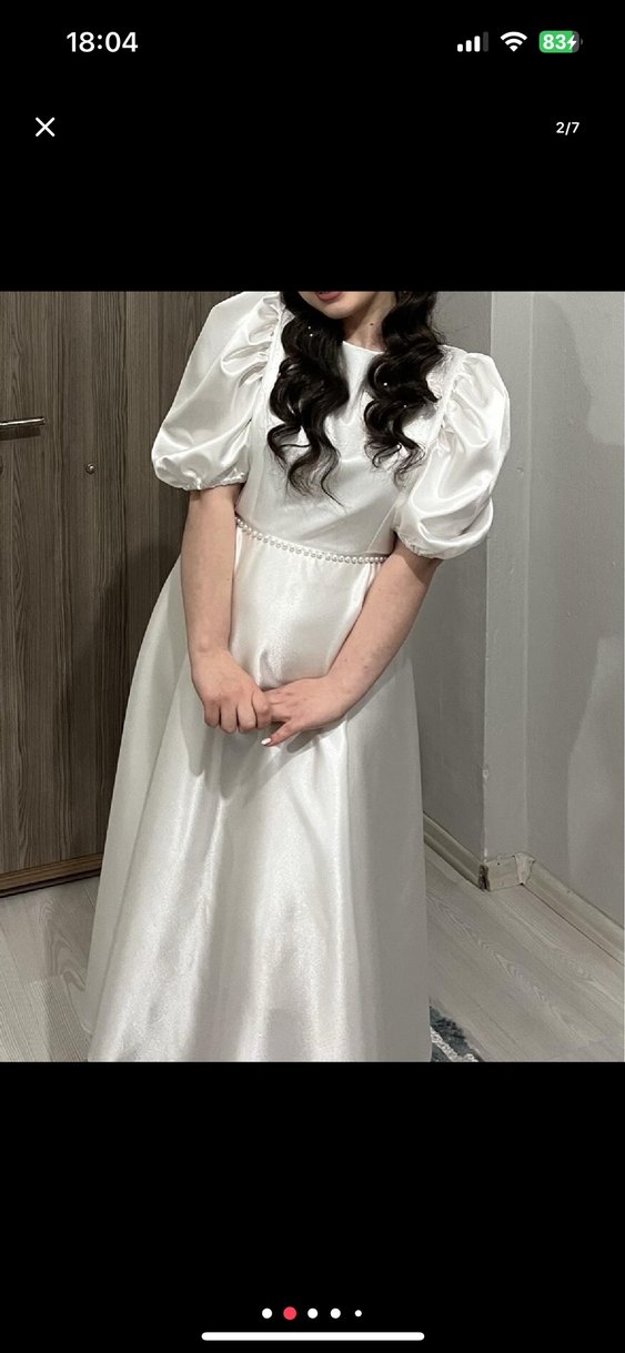 Parlak beyaz renkli, tekne yaka ve kısa kabarık kollara sahip, klasik ve şık kesimli A-line gelinlik.