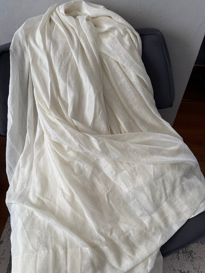 Parlak beyaz renkte, desen içermeyen, bohem tarzda yumuşak ve hafif bir perde.