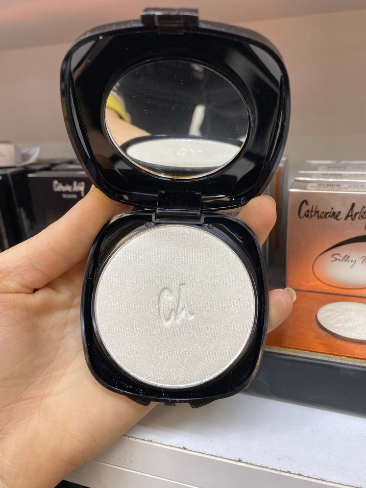 CatherineA markasına ait parlak beyaz yüz pudrası, pürüzsüz dokulu ve aynalı kompakt kutuda. ✨