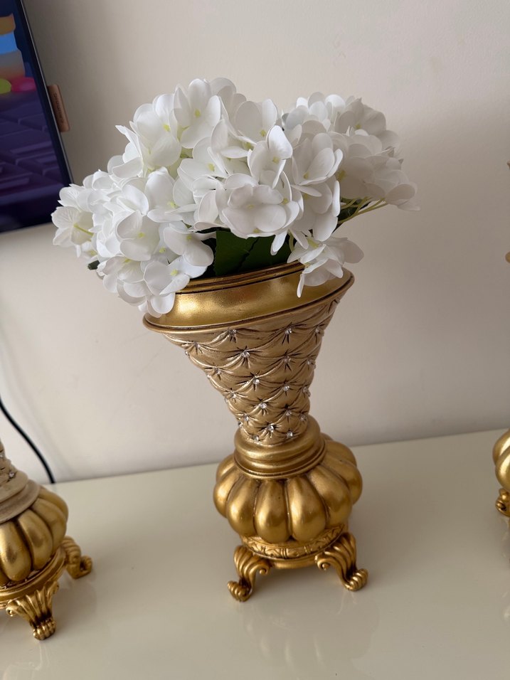 Parlak Beyaz Çiçekli Altın Renk Vazo