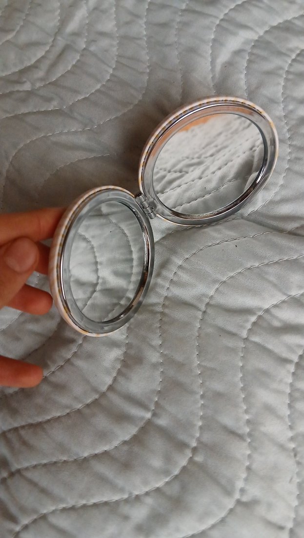 Parlak beyaz renkte, çift taraflı kullanıma uygun kompakt cep aynası.