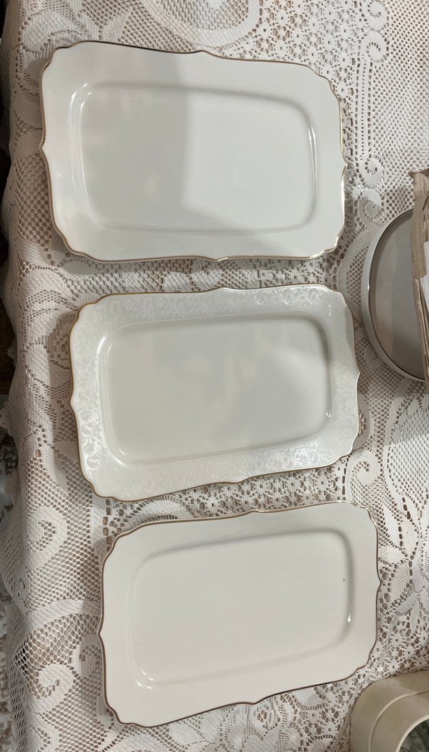 Parlak beyaz dekoratif sunum tabakları, kenarlarında hafif detaylar bulunur, yiyecek sunumu için uygundur. ️