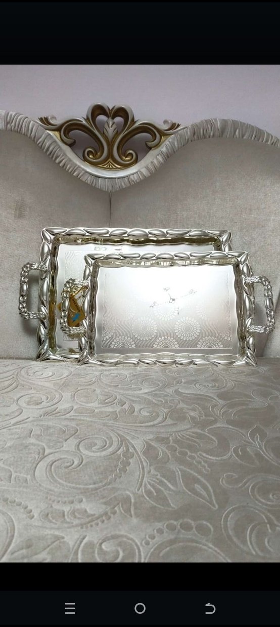 İki adet parlak beyaz dekoratif tepsi, işlemeli desenler ve süslü saplarla servis veya sunum için uygundur. ️