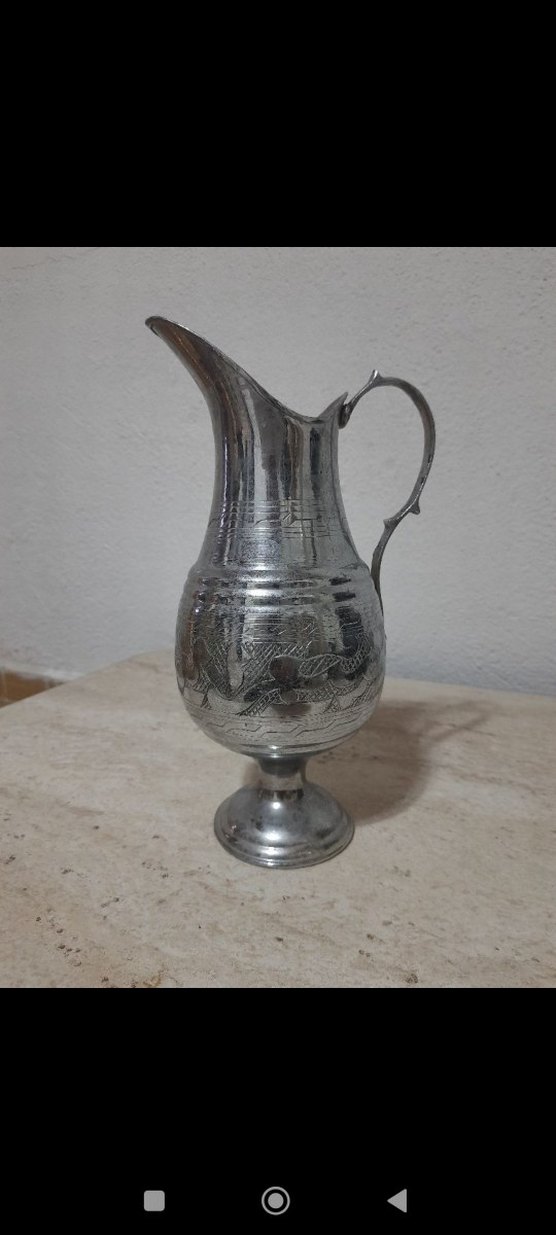 Parlak beyaz renkte, detaylı işlemelere ve şık bir kulpa sahip dekoratif vazo. Zarif formu ile mekana klasik bir hava katar. üzeri işlemeli bakır üzerine nikel kaplama