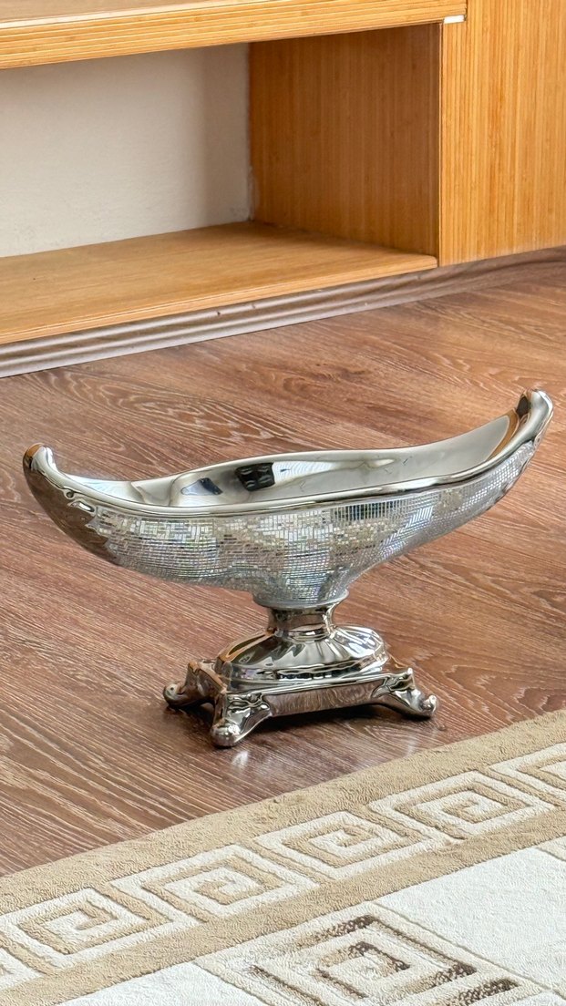 Parlak beyaz dekoratif vazo, zarif kıvrımlı tasarım ve detaylı taban ile şıklık katıyor.