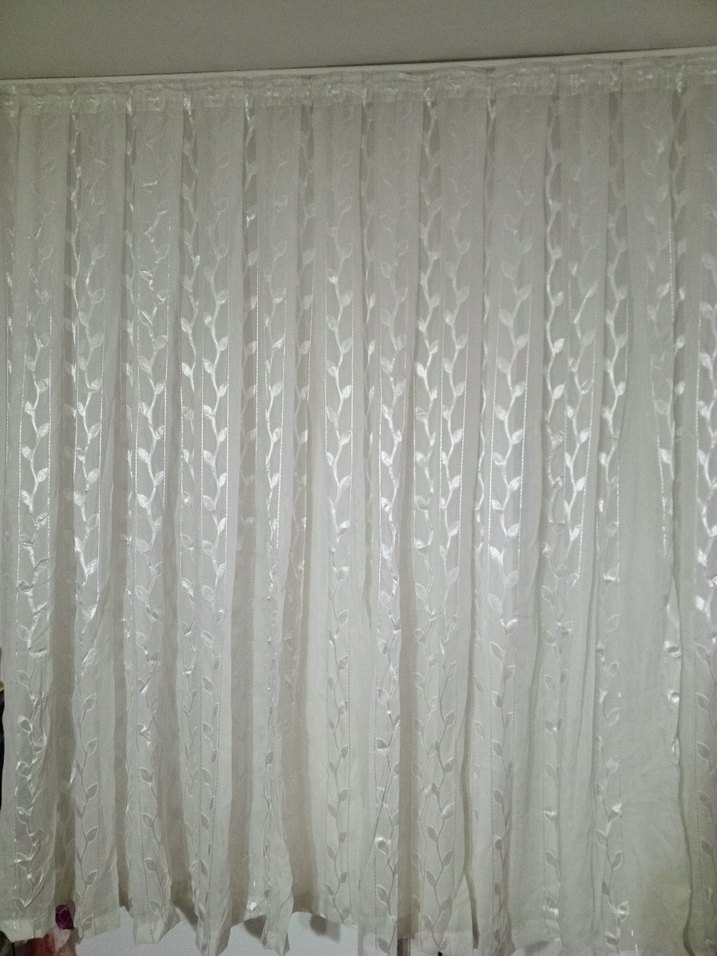 Parlak beyaz renkte, desenli, klasik tarzda, yaprak desenine benzer hafif dokusu ile şık tül perde. 2.80cm eninde, 1.80cm yüksekliğinde tül perde. Görselde görüldüğü gibi sadece kırışıklık var. Yıkanıp asılırsa tertemiz olur. Aklınıza takılan soruları sorabilirsiniz. Ona göre alınız iade kabul edilmez.