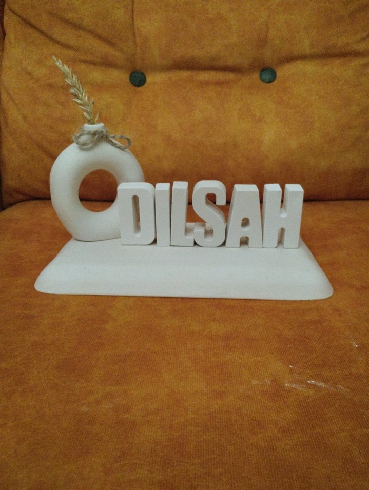 Parlak beyaz renkte, "Dilsah" yazılı figürin. Yuvarlak vazo ve dekoratif kuru bitki detayı bulunur. Pürüzsüz yüzeye sahiptir. ıstenılen ısım yapılır