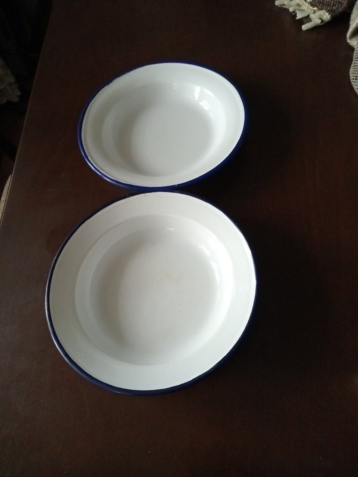Çok eskilerden kalma nostaljik çinko Mavi kenarlıklı, parlak beyaz emaye-çinko 2 adet tabak-çanak.Bir tanesinin arka kısmında sır dökülmesi vardır fotolarda gösterilmiştir lütfen bilerek alım yapılması.Belirtilen fiyat 2 adet giyatıdır.#çinkotabak