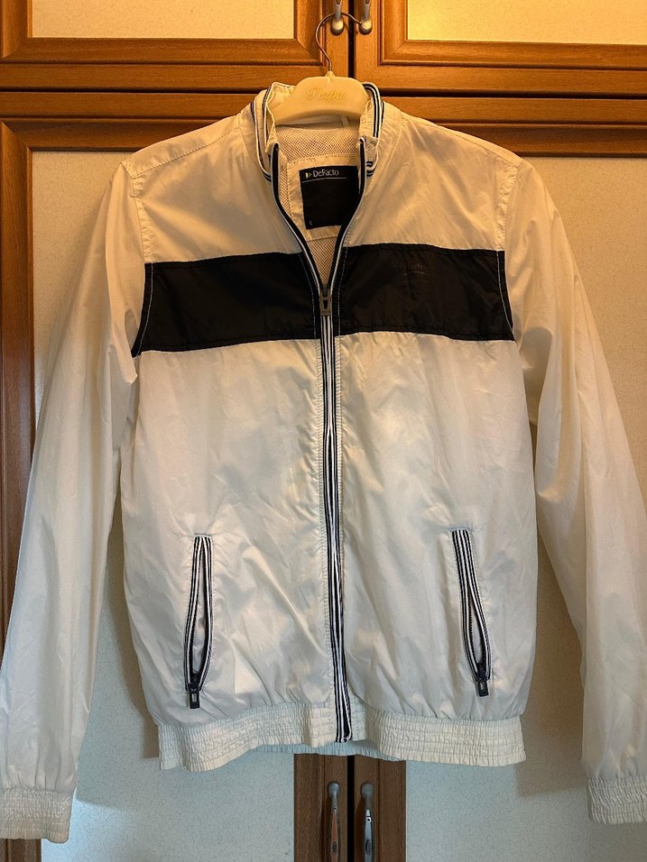Parlak beyaz, fermuarlı cepleri ve yüksek yakasıyla, uzun kollu, normal boyda, spor tarzda şık bir mont. İyi durumda ,deformesi yok.