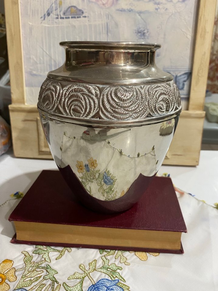 Parlak beyaz renkte, üst kısmı çiçek işlemeleriyle süslenmiş yansıtıcı yüzeye sahip vazo. Alman gümüşü donem urunu vazo