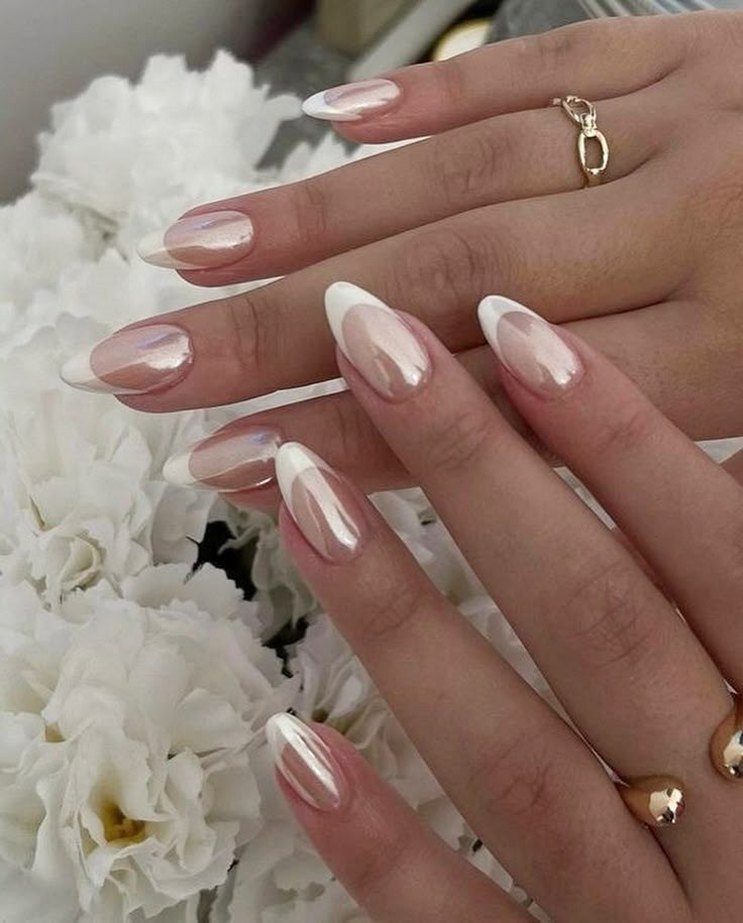 Parlak beyaz renkte, Fransız manikür tarzında tırnak süslemeleri, tırnaklara şıklık katıyor.