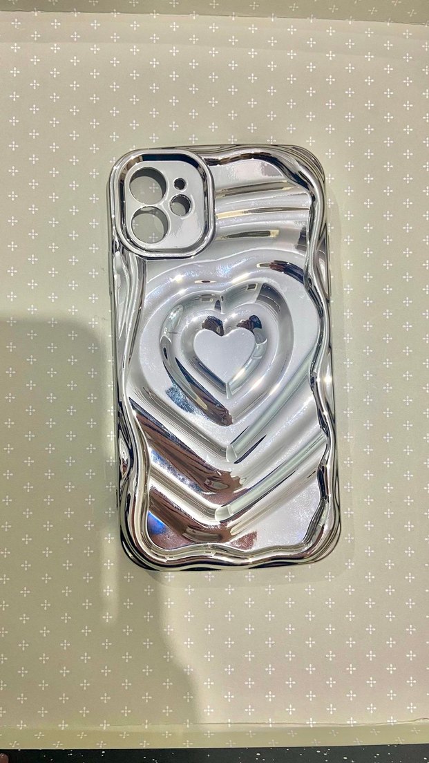 Parlak beyaz telefon kılıfı, çağdaş kalp deseni ve dalgalı kenarlarıyla şık bir görünüm sunar.