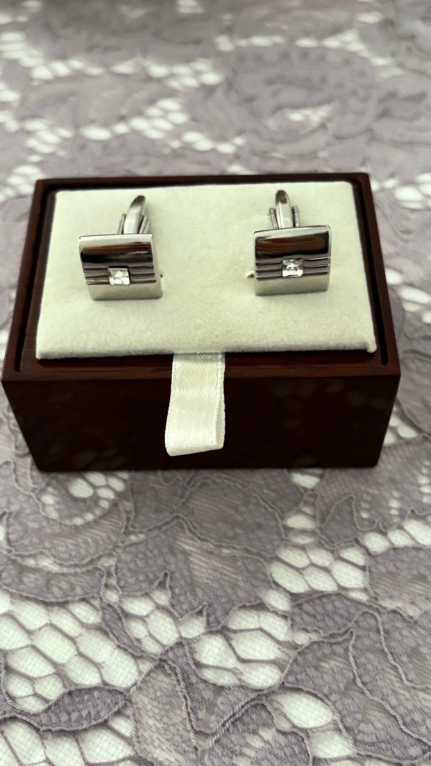 Küçük kristal detaylı parlak beyaz kare kol düğmeleri, ahşap kutuda. Çağdaş ve klasik tarzda. ✨