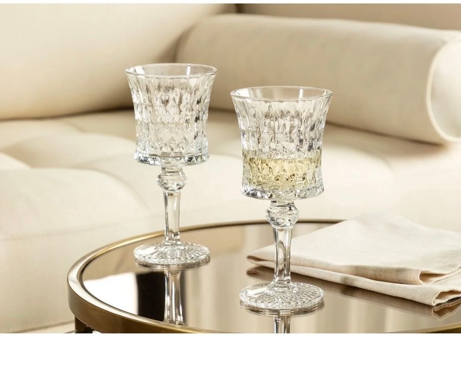 Parlak beyaz kristal kadehlerden oluşan set, detaylı dokulu tasarıma sahiptir. Zarif sunumlar için uygundur.