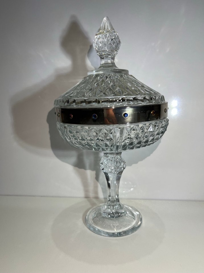 Parlak beyaz kristal kapaklı şekerlik, dekoratif gümüş bant ve detaylı kesim desenlere sahiptir. Ayaklı taban üzerinde durur.
