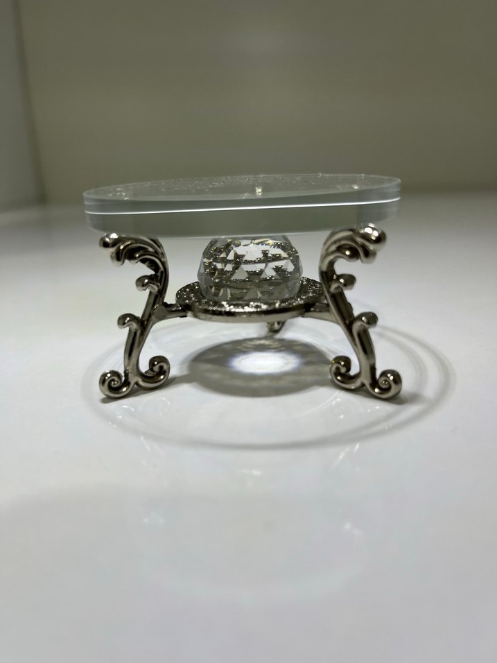 Parlak beyaz renkte, zarif kristal tabanlı ve süslü metal ayaklara sahip küçük mumluk.Sunumluk