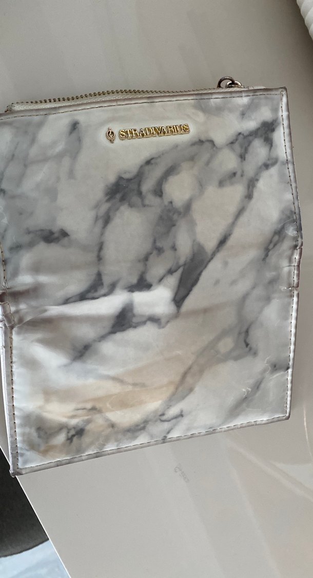 Parlak beyaz mermer desenli, sentetik kumaştan yapılmış, fermuarlı kadın portföy çanta. Günlük kullanıma uygun, modaya uygun ve avangart tarzda.