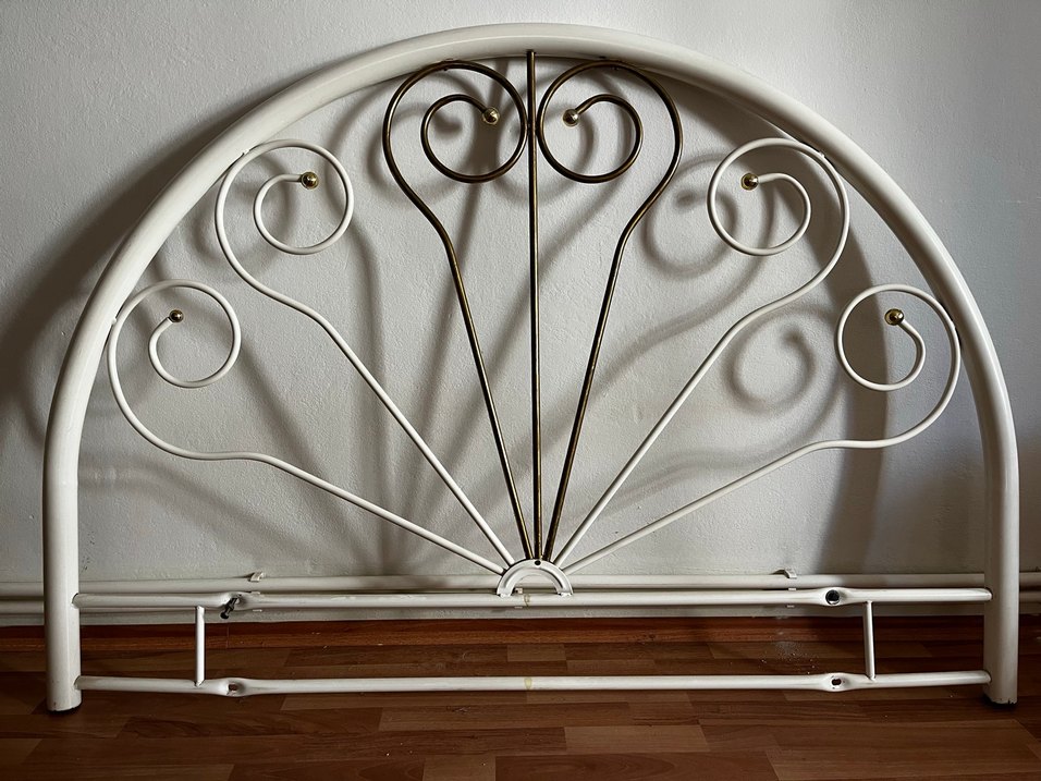 Parlak beyaz metalden yapılmış, kıvrımlı dekoratif çubuklara ve sağlam bir çerçeveye sahip çift kişilik yatak başı.