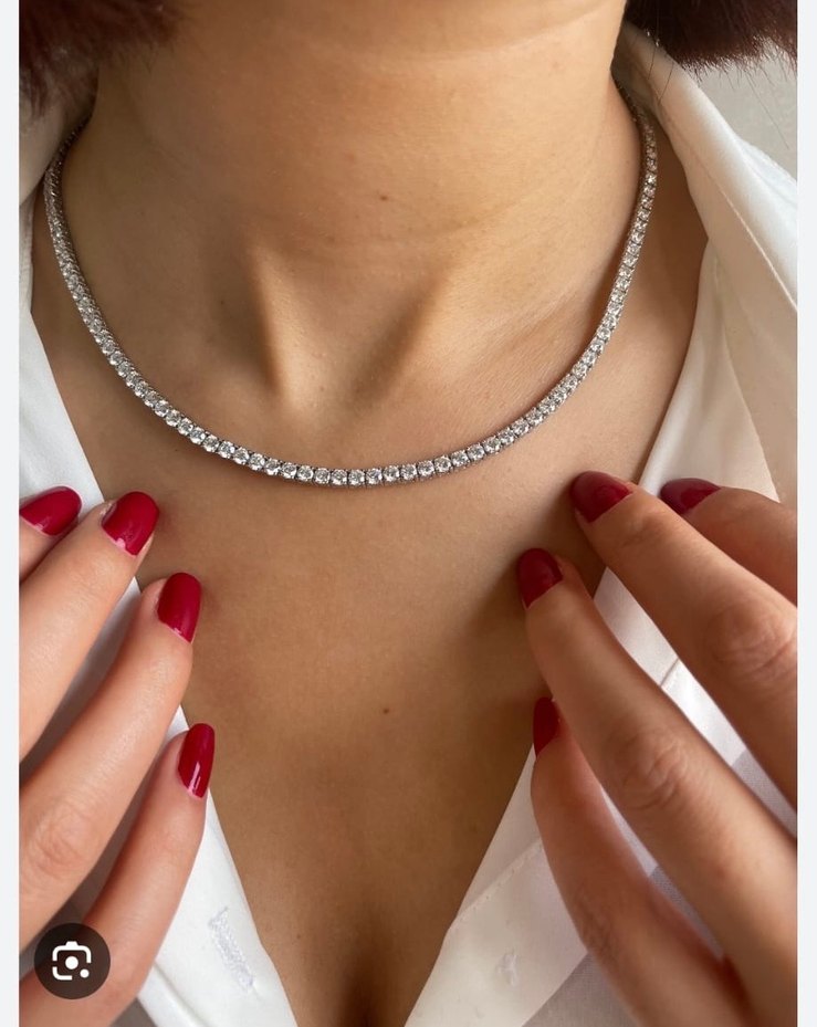 Parlak taşlarla süslenmiş, midi uzunlukta beyaz ve çağdaş tasarımlı kadın kolye, düğün ve özel günler için uygundur. ✨