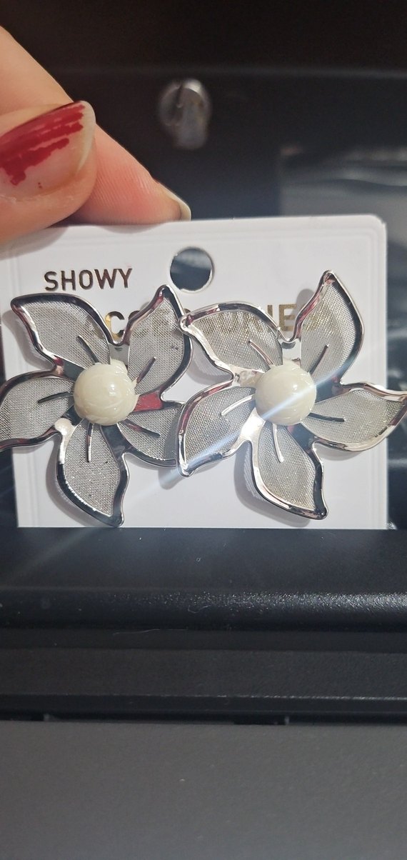 Parlak beyaz çiçek desenli, çağdaş tasarıma sahip mini küpeler. Düğünler için uygun, minimal ve cesur bir stil sunar.