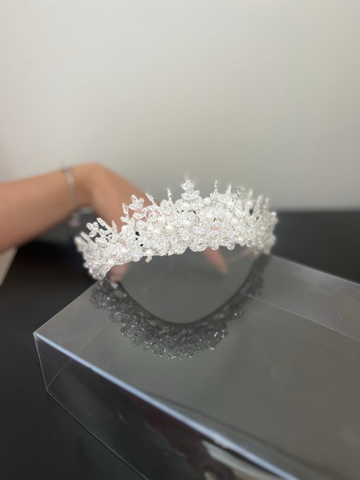 Parlak payetlerle süslenmiş beyaz gelin tacı, klasik zarafet ve çağdaş şıklığı bir araya getirir. ✨