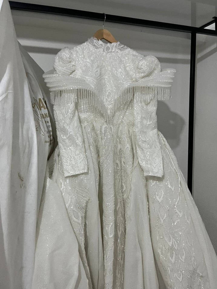 Parlak beyaz kumaştan, uzun kollu ve yüksek yakalı, boncuk işlemeli ve püsküllü detaylara sahip, dar kesim prenses gelinlik. Uzun boyu ve avangart tarzı ile dikkat çeker.