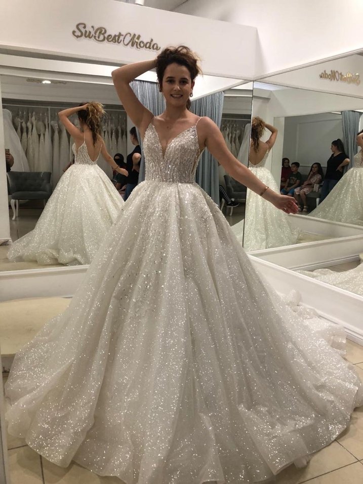 Bu bol kesim, uzun boy gelinlik, kolsuz ve V yakalıdır. Parlak beyaz kumaşıyla modern klasik tarzda göz alıcı bir şıklık sunar. 1 kez düğünümde ve dış çekiminde kullandım. Gerçekten hayalimdeki gibi ışıl ışıl harika bir gelinlik. Ben A kesimdi içine parça koydurup kabarttım ama parça bir iplikle dikilmiş istemeyen için direk çıkartılır A kesim olarak da kullanılabilir. Göğüs dekoltesini kapattım açık olmasın diye ama isteyen açtıradabilir.