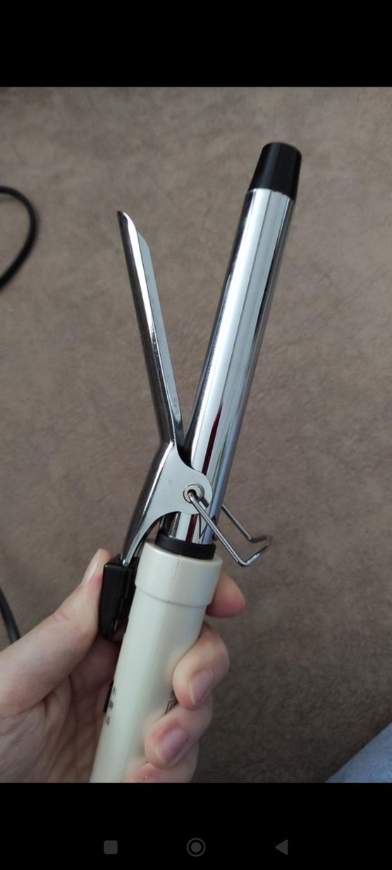 Parlak beyaz renkte, metal kelepçeli saç maşası. Saçları kolayca şekillendirmek için tasarlanmıştır.✨