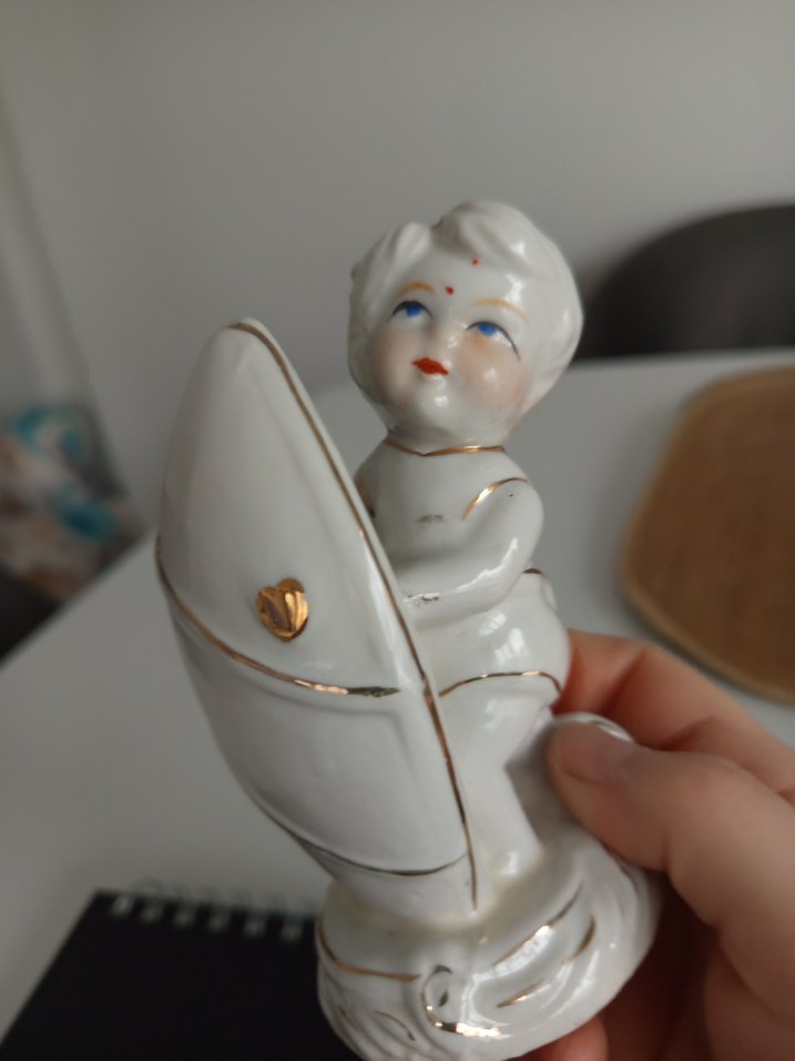 Parlak beyaz seramikten yapılmış, altın detaylı bir çocuk ve sörf tahtası figürini.