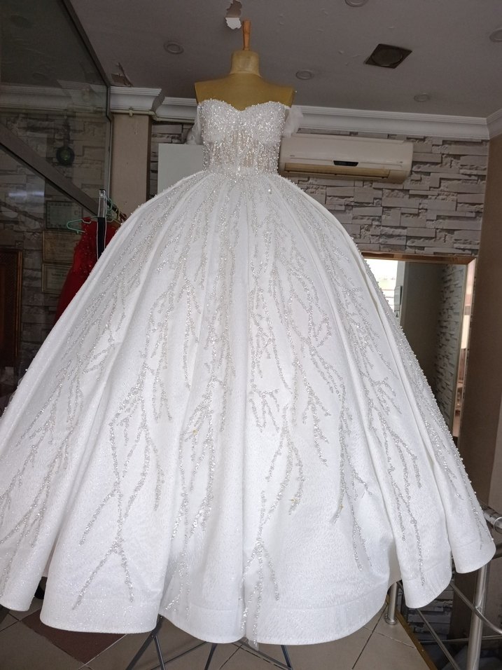 Parlak Beyaz Straplez Prenses Gelinlik