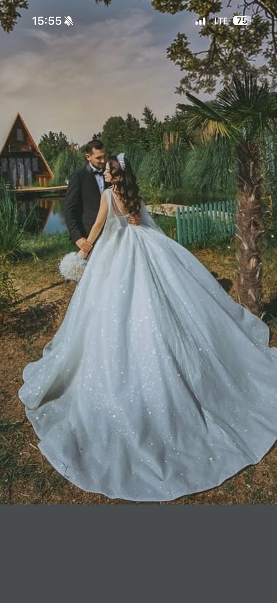 Uzun, straplez ve bol kesim olan bu gelinlik, parlak beyaz kumaşı ve bohem tarzıyla klasik zarafeti ve görkemi bir araya getiriyor.