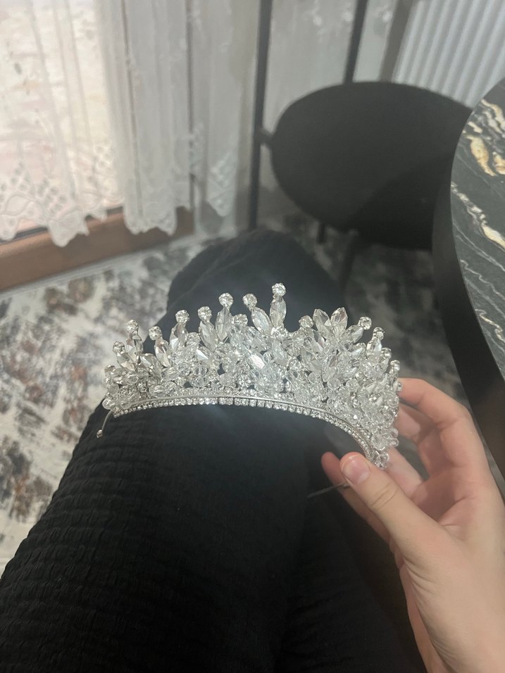 Parlak taşlı, beyaz gelin tacı, göz alıcı ve gotik dokunuşlu şık tasarımıyla klasik zarafeti yansıtıyor.