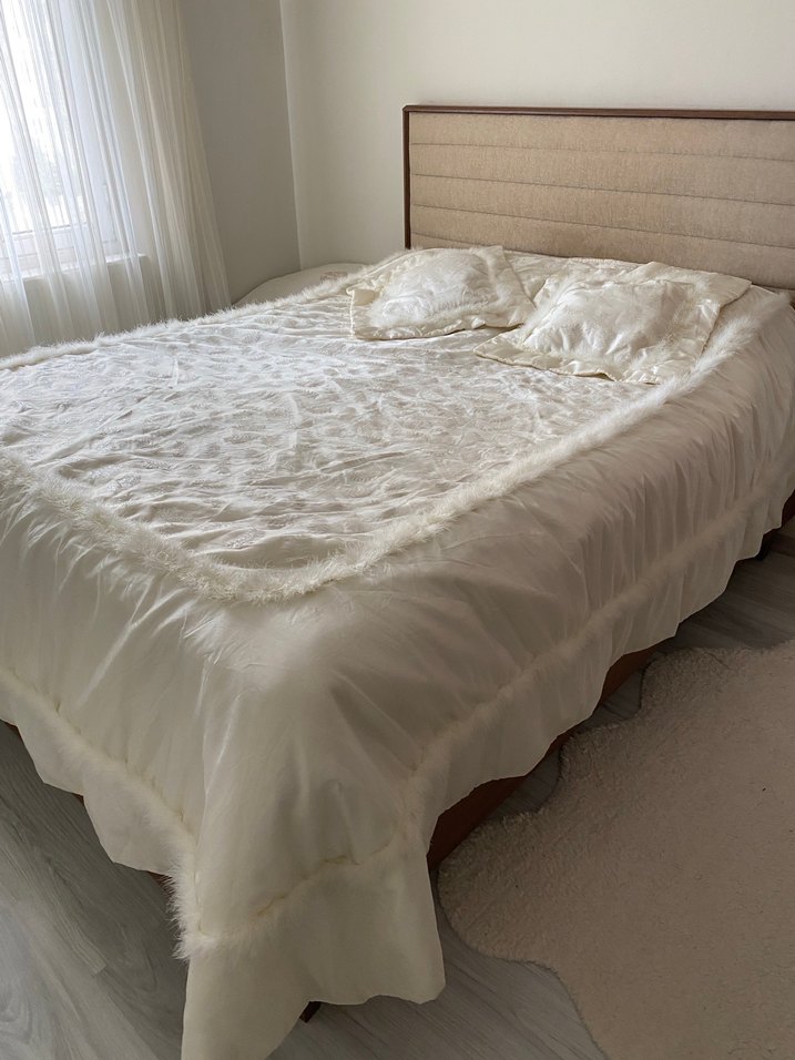 Parlak beyaz, desenli tüylü sahip yatak örtüsü, yatak odasına şık ve temiz bir görünüm kazandırır. ✨ küçük iki lekesi vardır ürün temiz ve yıkatılmıştır