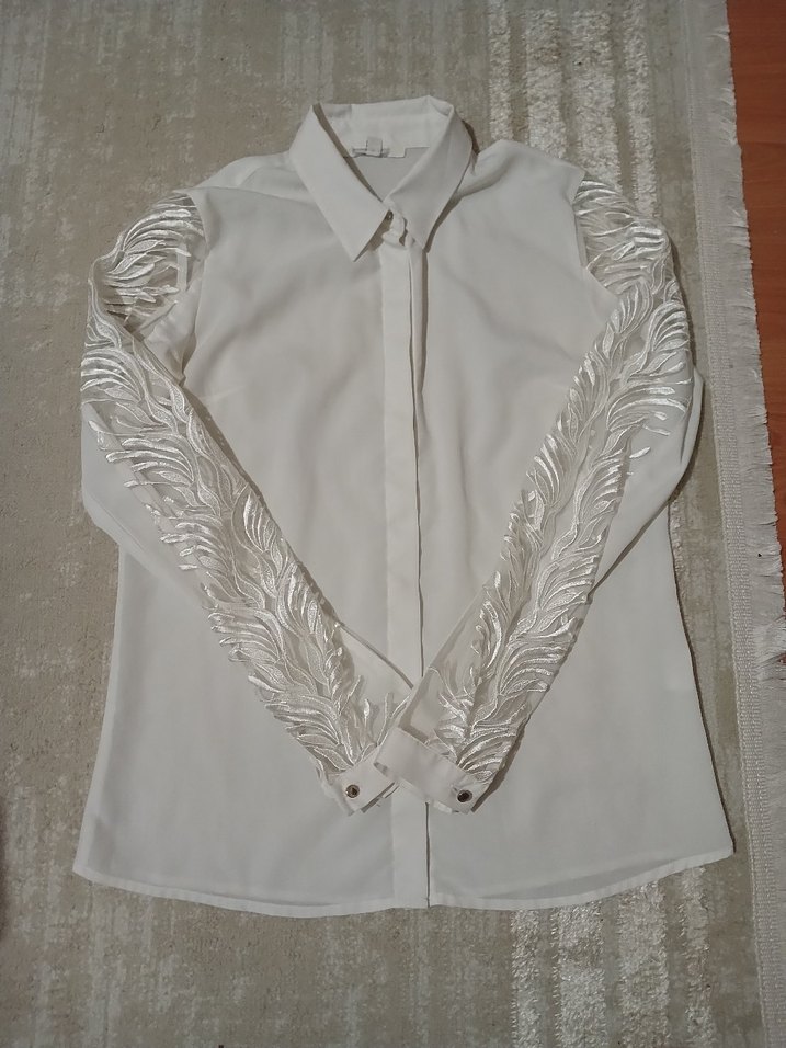 Parlak beyaz, uzun kollu, düğmeli ve yakalı kadın gömleği. Kolları detaylı ve şık, normal kesim, ofis ve günlük kullanıma uygun. ✨ 34 beden iki koltuk alti genişliği 47 cm hafif likralı