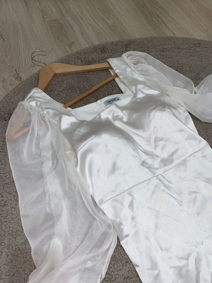 Parlak beyaz kumaştan, V yakalı ve uzun, şeffaf kollu, vintage ve modern tarzı birleştiren dar kesim elbise nikah için kullanıldı.