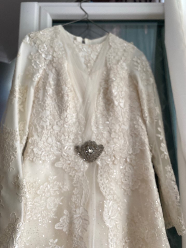 Fitted kesim, uzun kollu ve notched lapel yakalı bu A-line gelinlik, parlak beyaz dantel detaylarıyla vintage tarzda, klasik şıklık sunuyor.