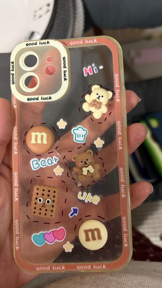Parlak yüzeye sahip pastel kahverengi bohem tarzı telefon kılıfı, sevimli ayı ve 'good luck' yazılarıyla süslenmiştir.