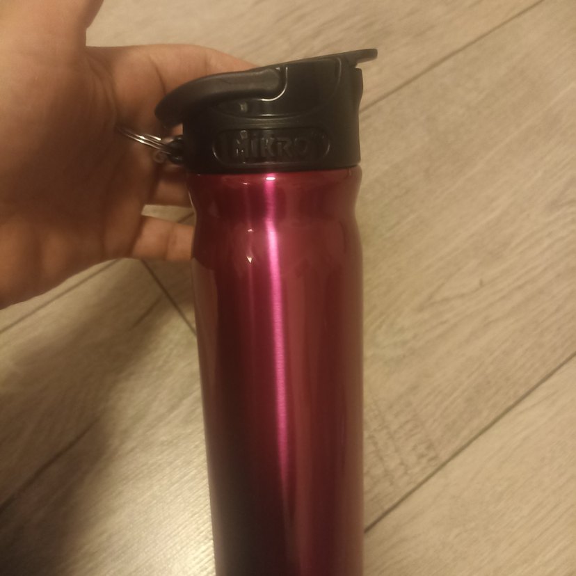 Parlak bordo renkli, siyah kapaklı ve anahtarlık halkalı çocuk termos şişesi.