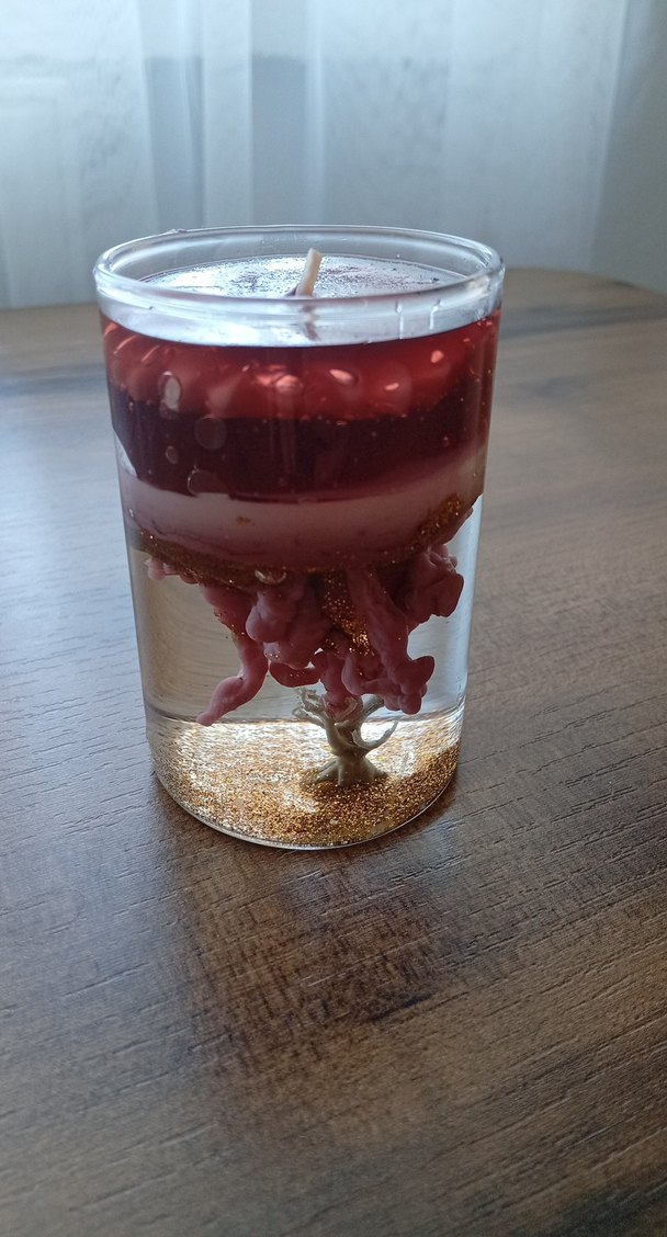 Parlak bordo renkte, alt kısmında altın sim detayları olan dekoratif mum. Şeffaf cam içinde katmanlı tasarım.