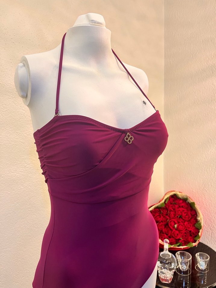 Parlak yüzeyli bordo renk, drapeli detaylı ve askılı kısa uzunlukta mini kadın mayo, gösterişli parti tarzı için uygundur. Kod 00028