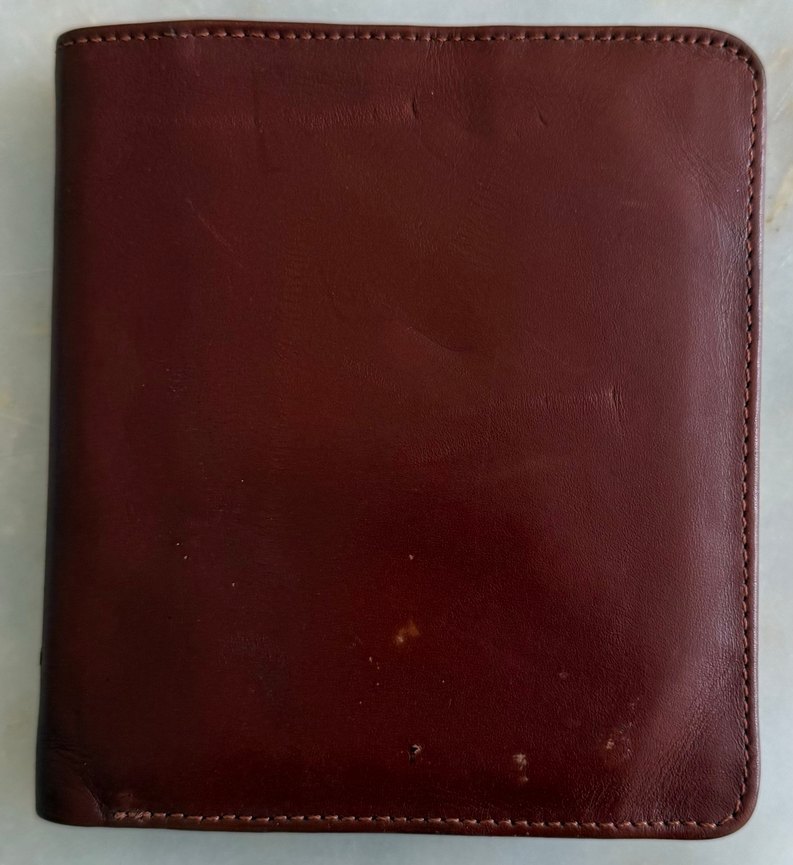 Parlak bordo renkte, desen içermeyen sade ve minimalist erkek cüzdanı. Üzerinde hafif aşınma izleri bulunur.