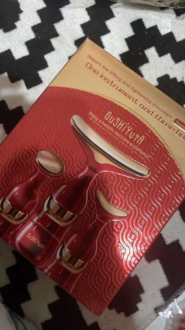 Parlak bordo renkli GuSHiYutA marka, kaldırma ve sıkılaştırma masajı için bir alet ve üç başlıklı makyaj fırçası seti. ✨