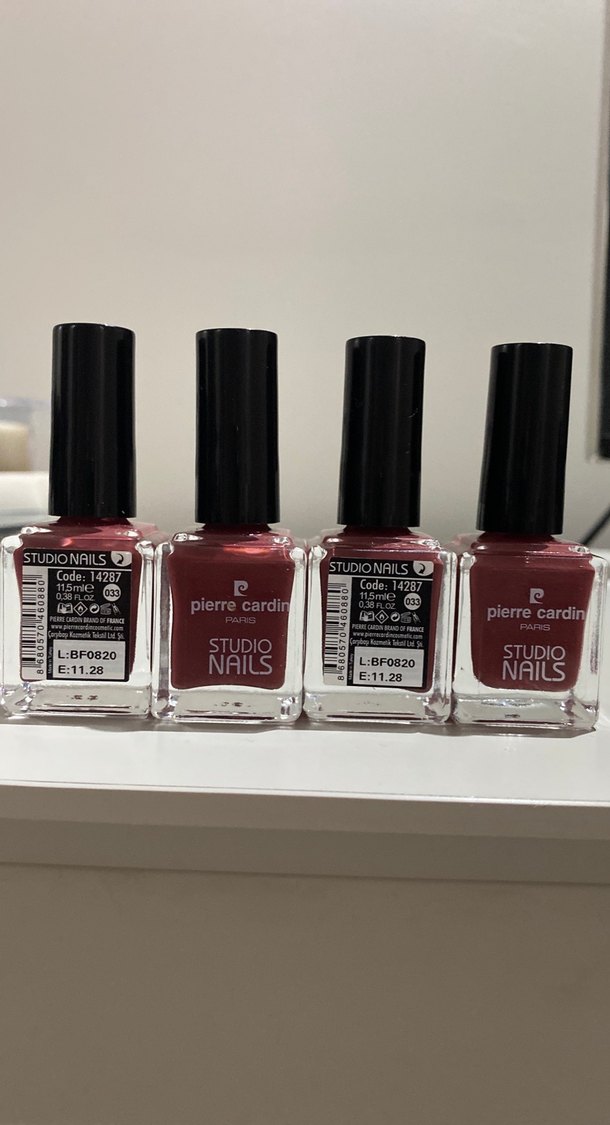 Pierre Cardin Studio Nails markalı, parlak bordo renkte oje. Pürüzsüz uygulama ve canlı bitiş sağlar. Üzerinde "STUDIO NAILS PARIS" yazısı bulunur. 4 adet mevcut adet fiyatı 100